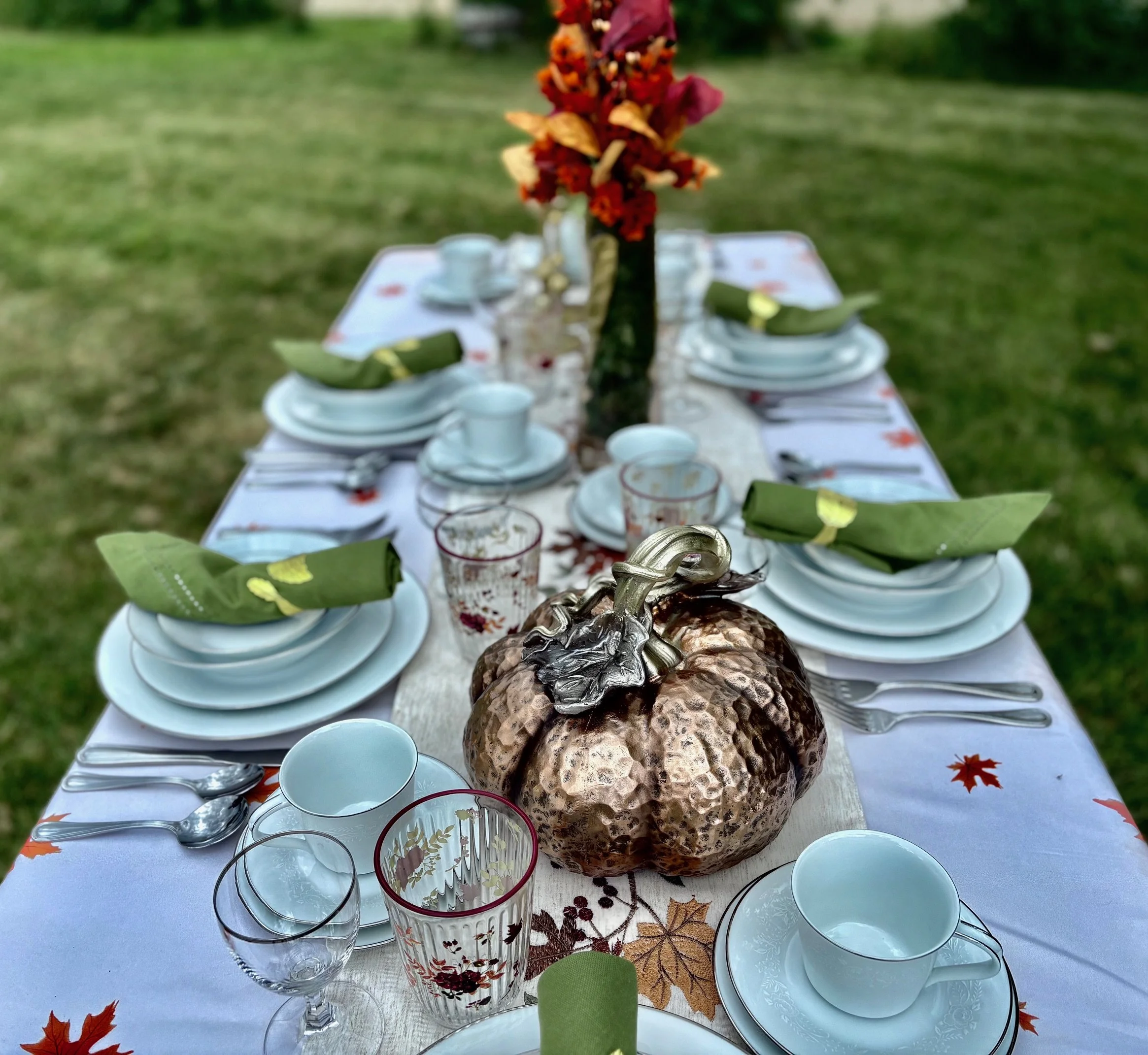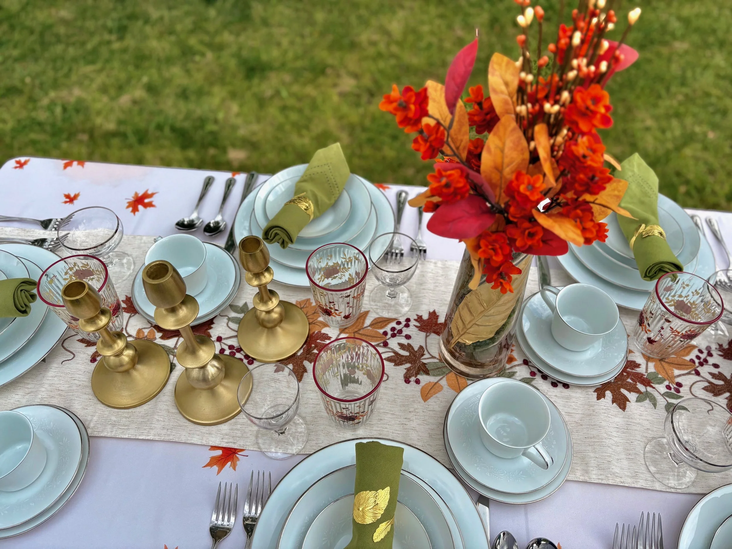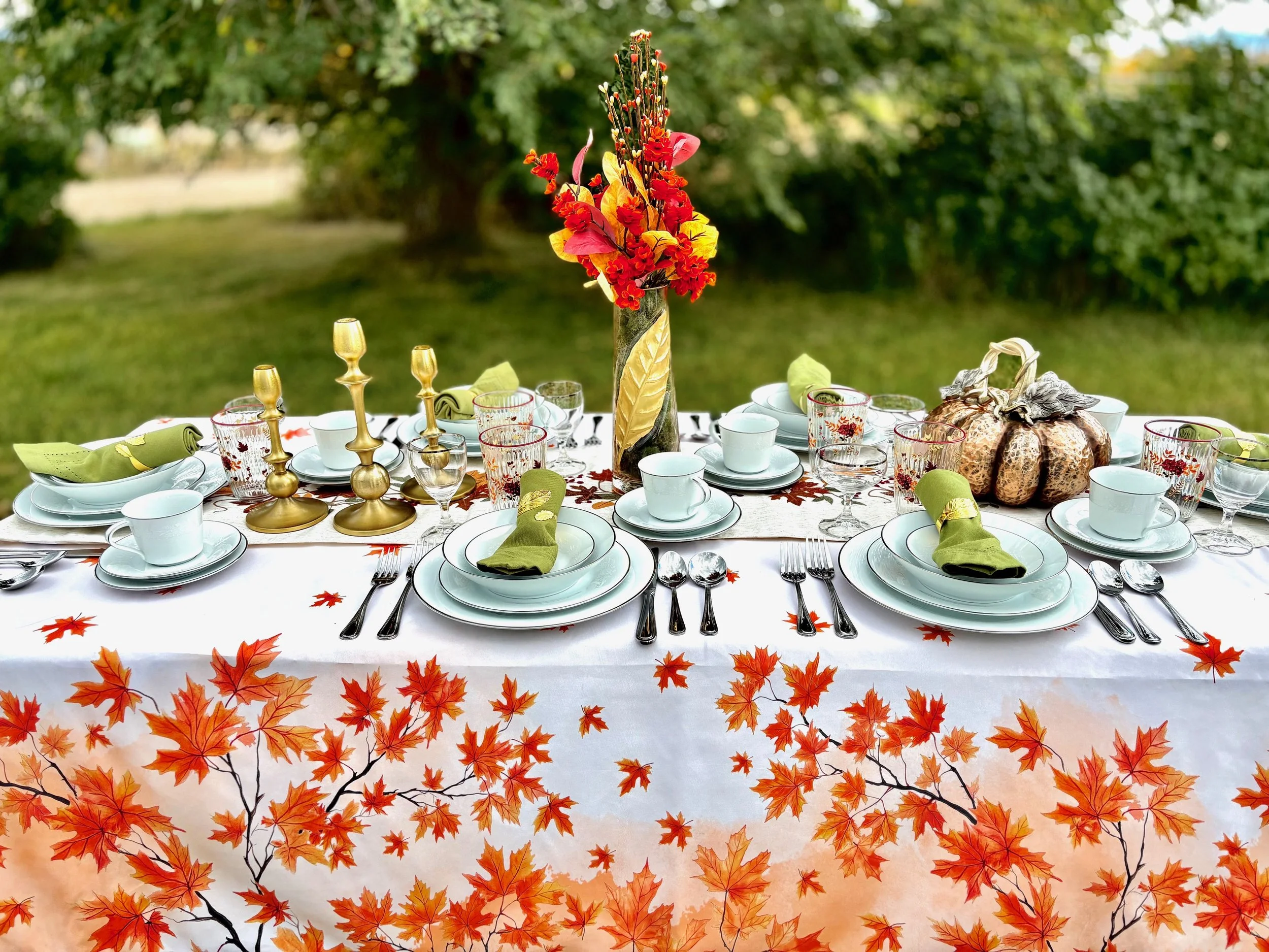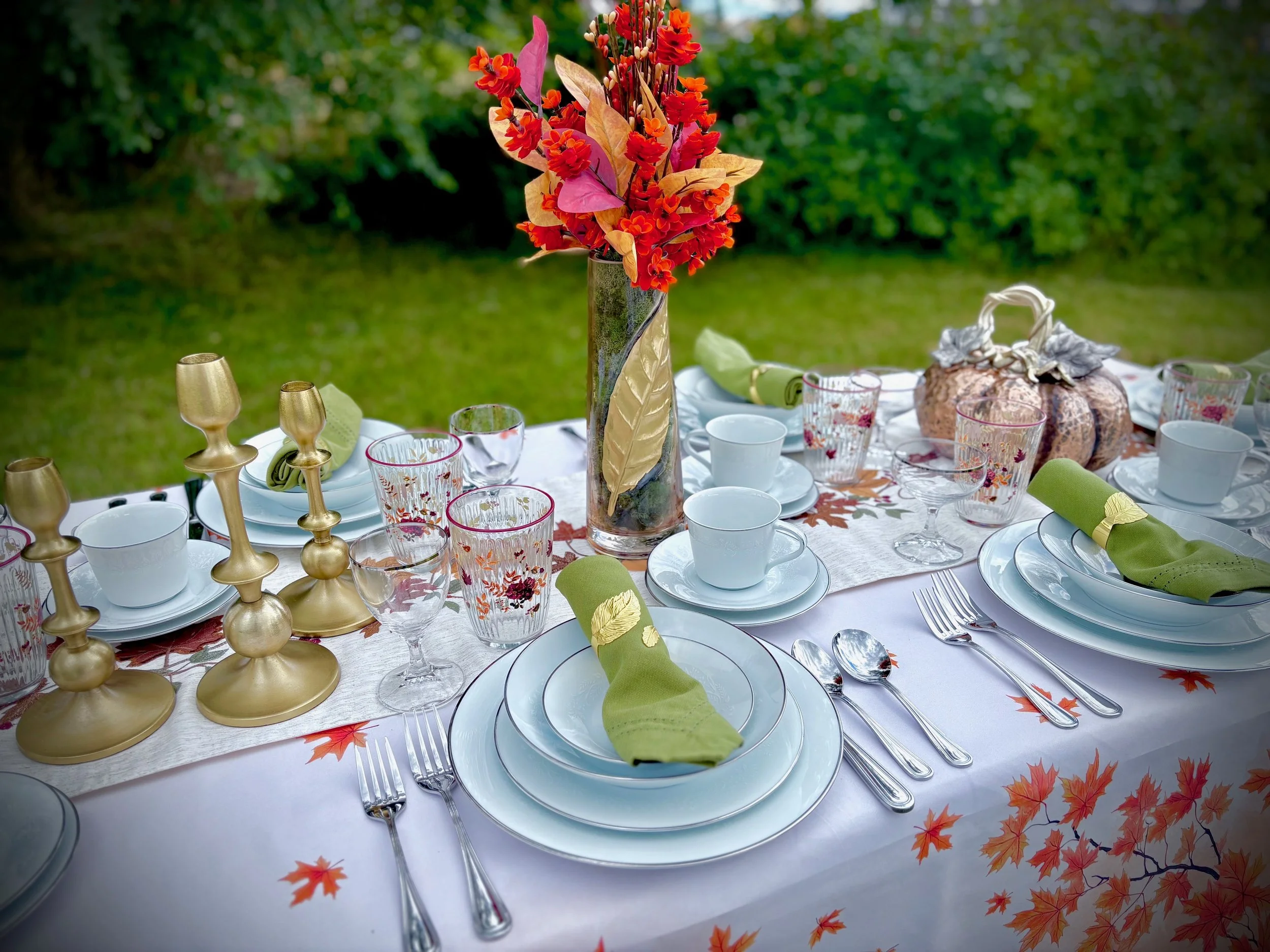 Elevate your Thanksgiving or Autumn celebration with a stunning tablescape that artfully blends seasonal charm and refined elegance. Adorn your table with delicate, gold-rimmed dinnerware and polished silverware that catch the warm glow of candlelight. Rich, earthy tones in your linens and napkins complement autumn-inspired centerpieces in vibrant hues of amber and crimson to create a captivating focal point. This sophisticated setting transforms your holiday meal into an unforgettable experience, where tradition meets timeless style.